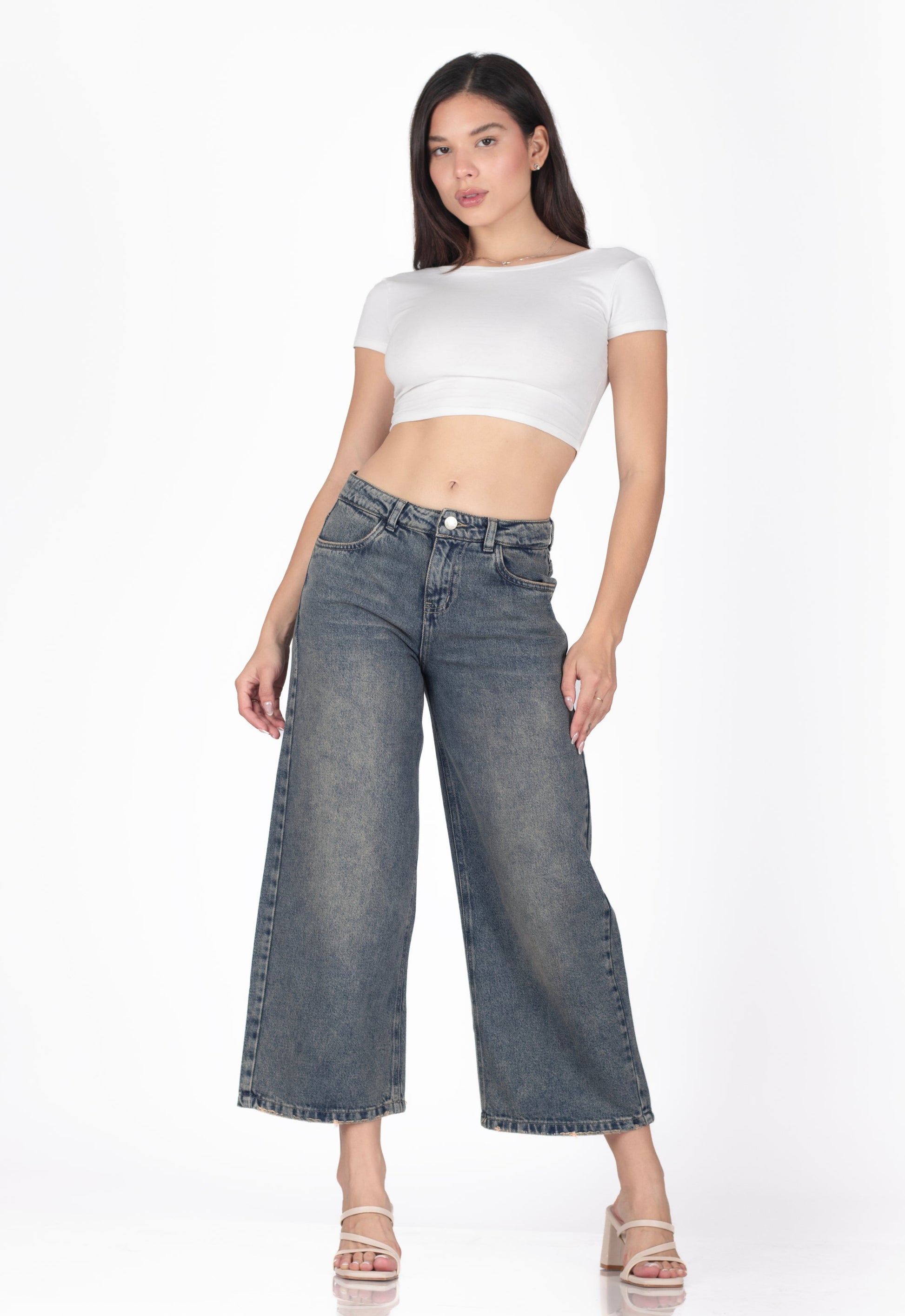 Modelo elaborado en rígido en un diseño cropped de tiro alto. De corte amplio, con ajuste clásico en la cintura y cadera, y caída recta y holgada desde el muslo hasta el tobillo.